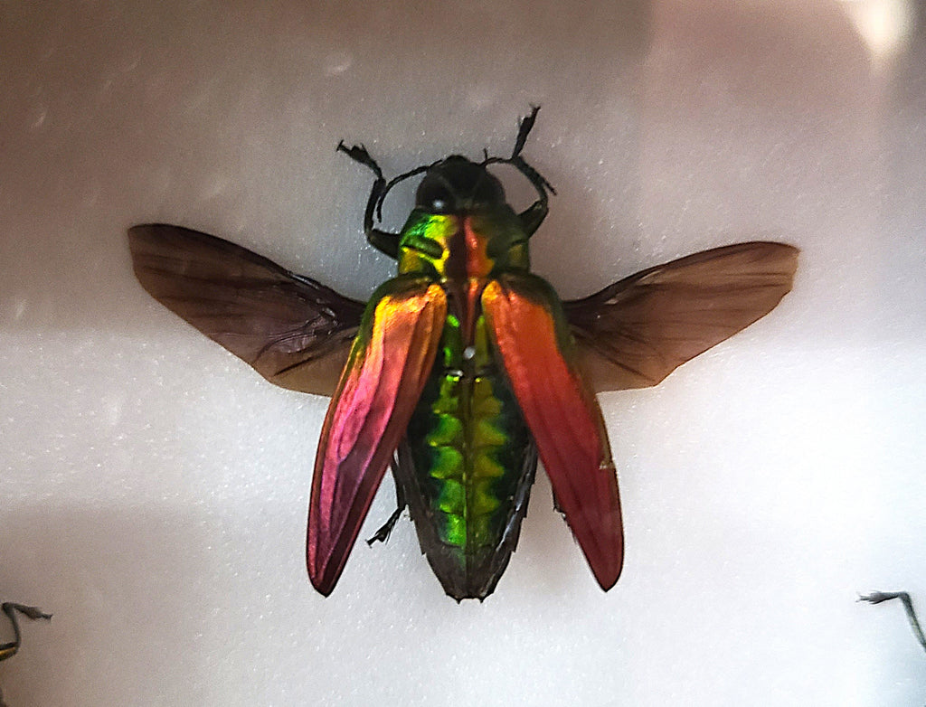 Belionota sumptuosa is also known as the tricolour metallic wood-boring beetle is apart of the family Buprestidae. This species is a type of jewel beetle and can be found in Indonesia. As all of our specimens are real the look of the specimen will vary slightly.