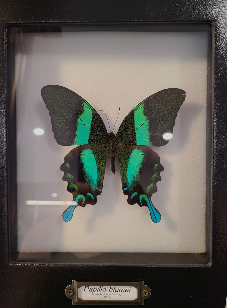 Papilio blumei, the peacock or green swallowtail, is a butterfly of the family Papilionidae. It is found only on the Indonesian island of Sulawesi It is sometimes confused with the more widespread P. palinurus, but that species is smaller and has mostly black tails (in P. blumei, the upper surface of the tails is mostly bluish green). The wingspan of P. blumei is 120–140 mm (4.7–5.5 in). The colours on the wings of some of these butterflies are metallic and are eye catching especially when viewed from a particular angle. As all of our specimens are real the look of the specimen will vary slightly.