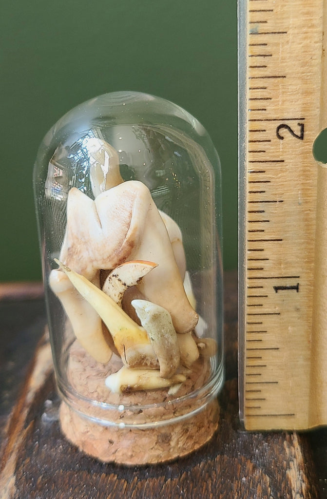 Cloche selected at random. photo may not be the one you receive. Assorted mammal teeth. May include: Coyote, raccoon, fisher, muskrat, beaver, deer, fox etc.